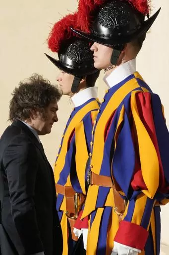 The Vatican said the two men met for an hour and 10 minutes, an unusually long audience by Francis’ standards, especially given no translation was required. Vatican video showed a smiling Francis briefly grasping Milei's arm for support as they walked to his desk at the start of their meeting.