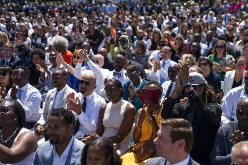 WASHINGTON (AP) — President Joe Biden welcomed a crowd to the White House lawn Monday to showcase a new law meant to reduce gun violence, celebrating “real progress” after years of inaction. But he also lamented the country remains “awash in weapons of war” — with the 16-day-old law already overshadowed by yet another horrific mass shooting.