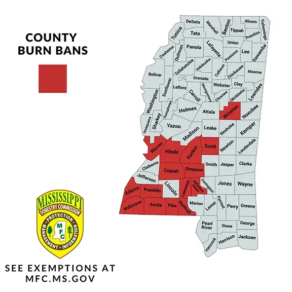At press time Tuesday, the Mississippi Forestry Commission (MFC) reported that 13 counties across Mississippi, were currently under active burn bans and the number was steadily growing. The additional counties are Franklin, Hinds, Jefferson Davis, Pike, Walthall, Wilkinson, Amite, Copiah, Rankin, Adams, Simpson, Winston Warren, and Lawrence.