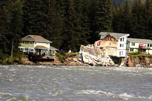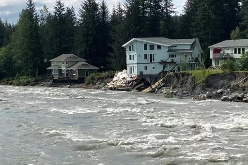 JUNEAU, Alaska (AP) — The gray, two-story home with white trim toppled and slid, crashing into the river below as rushing waters carried off a bobbing chunk of its roof. Next door, a condo building teetered on the edge of the bank, its foundation already having fallen away as erosion undercut it.