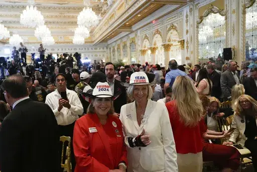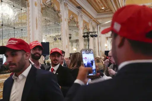 Dozens of supporters, many clad in pro-Trump gear, stood near their seats and craned their necks to see if the GOP nominee and former president were about to enter an ornate Mar-a-Lago room set up for his remarks.