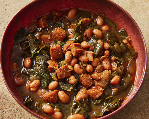 Canned beans, either pinto or pink beans, streamline prep. Bittersweet collard greens simmer low and slow for about half an hour, becoming meltingly tender. Fruity sweet paprika amplifies the flavor of the chorizo.