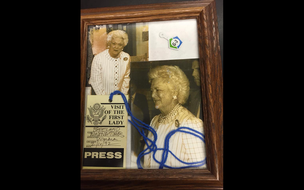 On the bookcase in my office, I keep my press pass — blue yarn still attached — my lapel clip and two of the now-faded photographs of the First Lady that I took. Yes, they came out just fine! They are still framed in the cheap dollar store frame I put them in 26 years ago. She deserves better than that, I suppose. But for the record, I’m just as proud of them today as I was that winter day in the darkroom in 1992 when they first appeared.