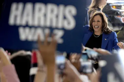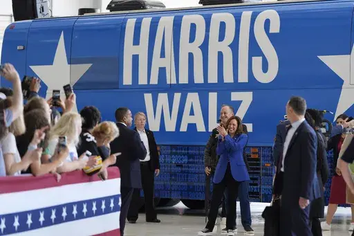 In a demonstration of the area's competing politics, Harris' bus and motorcade twice on Sunday rolled past groups of Trump supporters with signs and banners bearing his name.