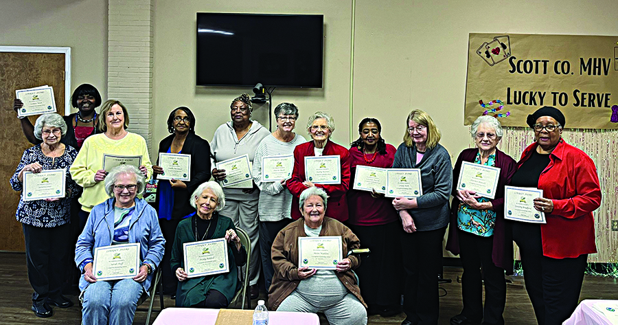 The annual Scott County MHV Awards Luncheon was held at the Scott County Extension office, on Tuesday, January 14. The theme for this year’s luncheon was Lucky to Serve. Pictured above are the MHV Members receiving Reading Certificates, Sandra Jones, Connie Wash, Sig Miles, Louella McConnell, Dorothy Strong, Sharon Smith, Kathy Warren, Carolyn Macon, Diane Kirk, Florence Measells, and Dorothy Bradford. Front row: Sarah Huff, Frisky Roland, and Helen Watkins. Each individual club has representatives in this category.