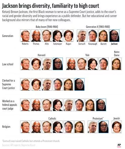 She helps form the most diverse court in its 232-year history and is the first former public defender to be a justice. The court that Jackson is joining is the most conservative that it has been since the 1930s. She is likely to be on the losing end of important cases, which could include examinations of the role of race in college admissions, congressional redistricting and voting rights that the court, with its 6-3 conservative majority, will take up next term.