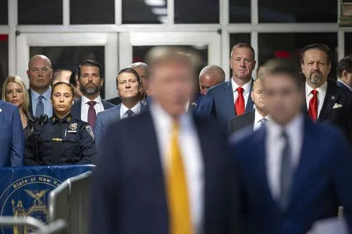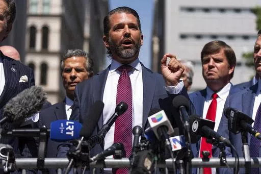 A group of Donald Trump's allies that included Republican state leaders, lawmakers, state attorney generals and his son Donald Trump Jr. held a news conference near the courthouse in Manhattan on Tuesday morning.