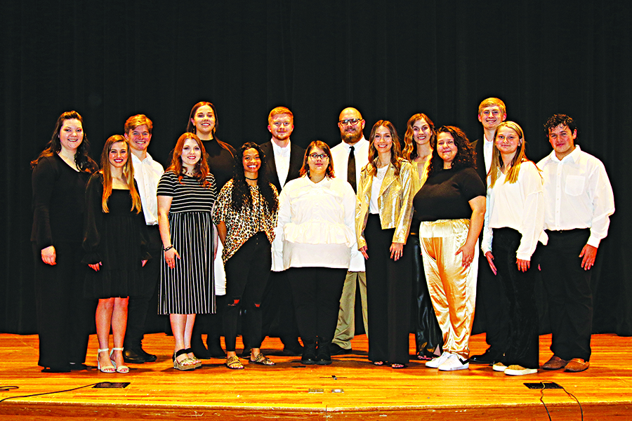 East Central Community College’s Vocé, an a cappella ensemble, recently performed its annual fall campus concert. Members include, from front left, Rachael Jennings of Lena, Kristina Alford of Carthage, Onnah-Symone Cross of Forest, Skye McElhenney of Lake, Annsley McMahan of Union, Lauren Gilmer of Little Rock, and Alison Anderson of Hickory. Back row, Bethany Chaney of Hickory, Luke Sanders of Forest, Emma Taylor of Philadelphia, Jake Dean of Little Rock, Malachi Beasley of Walnut Grove, Allison Pickel of Carthage, Matt McCall of Decatur, and Trey Nichols of Morton. Lucus Orndorff serves as director.