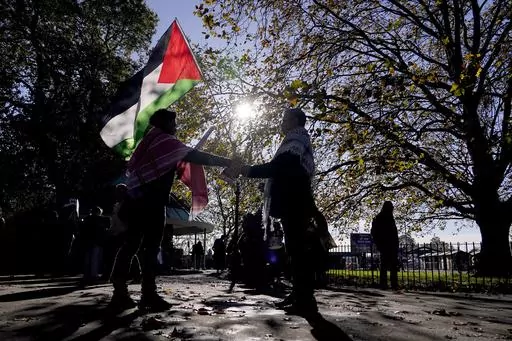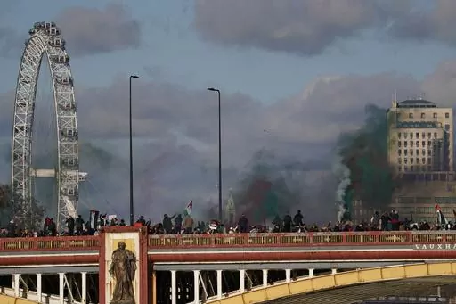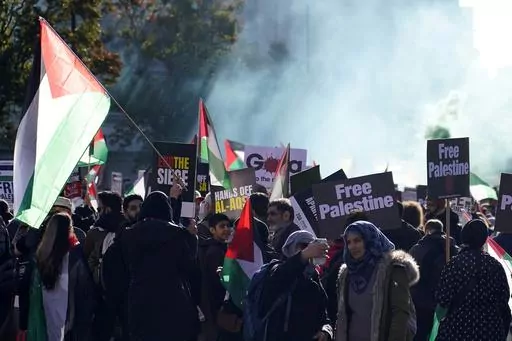 LONDON (AP) — Pro-Palestinian demonstrators marched peacefully through central London on Saturday, even as right-wing counter-protesters clashed with police, after a week of angry debate over whether to permit the event on a day when Britain honored its war dead.