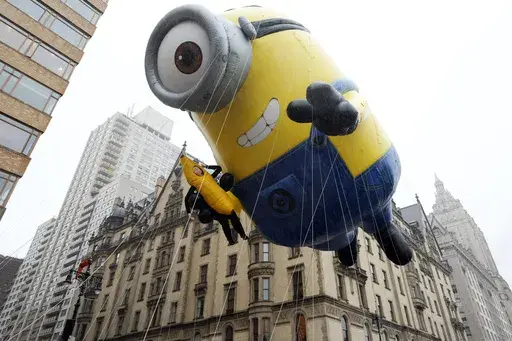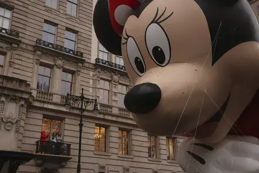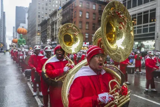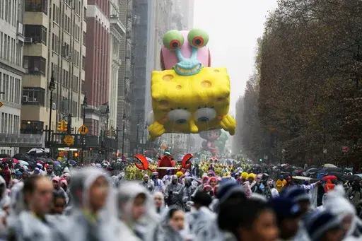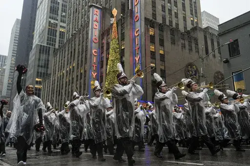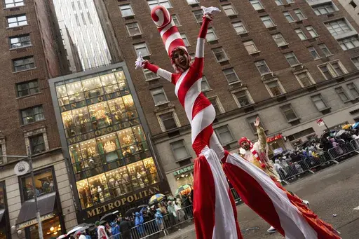 NEW YORK (AP) — The Macy's Thanksgiving Day Parade marched, soared and roared into its second century on Thursday despite a drenching rain and a brief disruption from pro-Palestinian demonstrators.