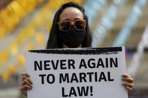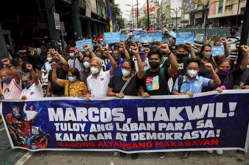 Marching in the streets, the protesters displayed placards that read, ”Never again to martial law” and “Reject Marcos-Duterte.”