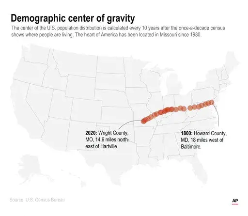 The nation’s population center is calculated every 10 years after the once-a-decade census shows where people are living. The heart of America has been in Missouri since 1980. Previously located in Plato, in the neighboring county, it moved only 11.8 miles (19 kilometers) southwest from 2010 to 2020. It is the smallest distance shift in 100 years and the second-smallest in U.S. history.