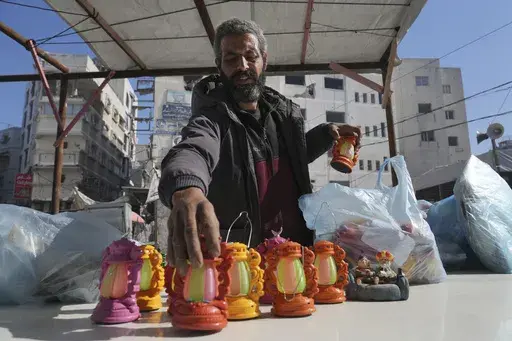 Saeed al-Bitar laid out his merchandise on a table: plastic toy lanterns. He told the AP there were far fewer shoppers this year and they didn’t have nearly the same purchasing power.