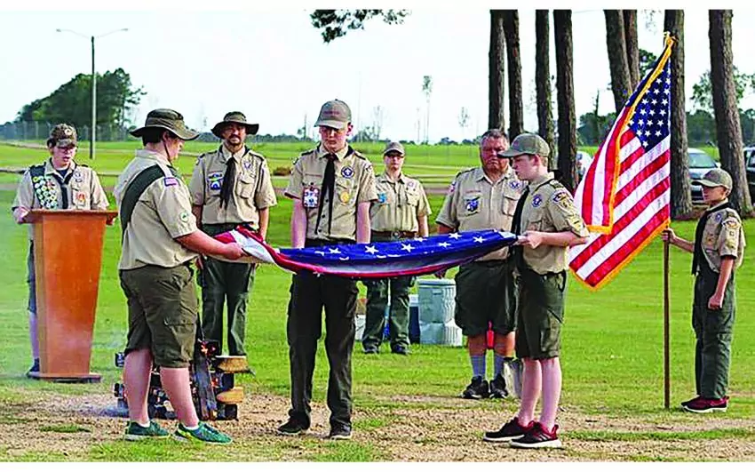 Members of BSA Troop 63 from Forest retired several American Flags during a ceremony held at Gaddis Park on June 20. Members pictured here during the retirement ceremony are: Waylon Crimm, Jeff Fountain, Terry King, Joseph Powell, Jackson Fountain, Anthony Gibbs, Cole Mitchell and Ethan Powell.