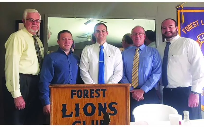 The Forest Lions Club welcomed new members in at there last meeting. The new members are welcomed here by current members. From the left: Jim Thompson, Membership Chair; Rob Hunt, Brady Power, new Lions Club members; George Adams and Drew Evans, Lions Club President.