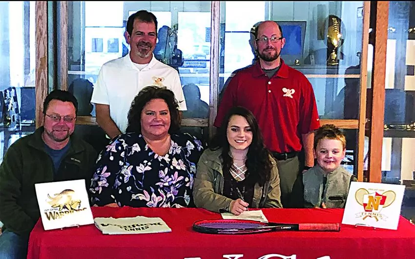 Newton County Academy senior Marla Graham, of Lake, signed on Friday, February 22 a tennis scholarship with East Central Community College. Pictured from front left, are, Keith Graham, Terri Graham, Marla Graham and Devyn Graham. Back, Coach Pete Mazzella and Assistant Coach David Burt.