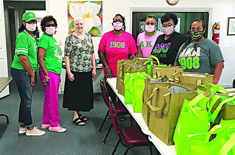 Alpha Kappa Alpha Sorority, Inc. Omicron Beta Omega Chapter of Meridian, Global Impact Committee donated essential personal hygiene items, educational supplies and snacks to the Excel Community Learning Center in Morton. This was done to render service to displaced families that are dealing with an economic crisis as well as COVID-19. Pictured from Left are Amanda Carter, Martha Kincaid, Marie Harman, Excel Learning Center, Director, Patricia Carr, Manola Erby, Alcorn State University Extension Specialist, Tiffani Jones, and Stephanie Smith.