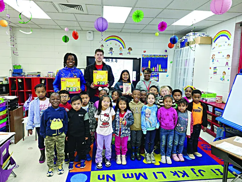 Forest High School athletes read the book Watch Me Throw the Ball by Mo Willems to Ms. Tanya Wash's FES kindergarten class. Pictured on the back row from left are Ja'Darion Ware, Ty Chambers, Dorcas De Leon, and Tanya Wash. The students were given treats donated by the Upsilon Kappa Sigma Chapter of Phi Beta Sigma Fraternity, Inc.
