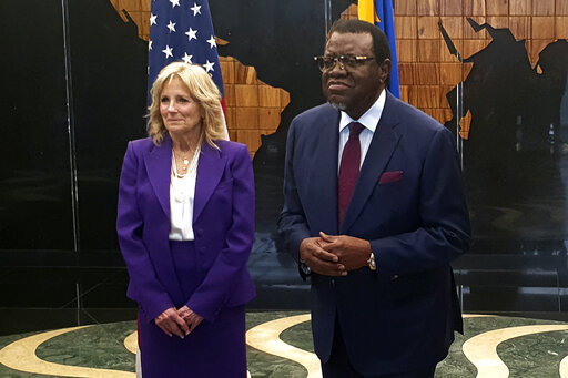 WINDHOEK, Namibia (AP) — Dancers, drummers and Namibia's president and first lady welcomed U.S. first lady Jill Biden on Wednesday as she opened a five-day, two-country visit to Africa aimed at highlighting the challenges facing women and young people and the food insecurity plaguing the Horn of Africa.