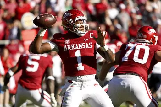 Arkansas is 12-2 against Ole Miss in Fayetteville. ... Five of the series’ past seven games have been decided by four points or fewer. … With a win, Arkansas coach Sam Pittman would become the school’s fourth coach to earn bowl-eligibility in each of his first three seasons. ... Arkansas LB Drew Sanders leads the SEC with 8.5 sacks.