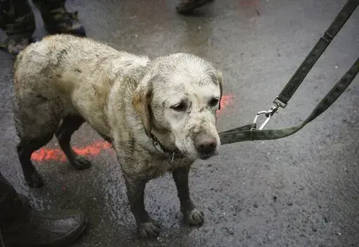THE FACTS: The image was taken in 2014 by a Reuters photographer after a deadly mudslide near Oso, Washington. Following Monday’s earthquake, old photos and videos showing a variety of tragedies — from tsunamis to building collapses — circulated widely, falsely identified as showing the aftermath in Turkey and Syria. Amid search efforts, where many countries have sent dogs and rescuers, incorrectly attributed images of dogs used in other search efforts emerged. One widely shared misrepresented image shows a dog caked in dirt as he stares directly into the camera. A person sporting a red sleeve and white glove is holding the dog’s leash. “This dog hero who worked the whole night and saved 10 lives in Turkey,” reads a caption on an Instagram post of the image. But the photo shows a rescue dog who helped after the 2014 mudslide in Oso, about 60 miles (97 kilometers) outside of Seattle, which killed 43 people. It was taken by Rick Wilking, a freelance photographer for Reuters. “Tryon the rescue dog waits to go through the decontamination area at the mudslide after searching for victims in Oso, Washington March 30, 2014,” a caption on the photograph states. The AP also published a similar image of Tryon taken by Wilking at the time. The 7.8-magnitude earthquake that struck southeastern Turkey, as well as Syria, during the early hours Monday toppled thousands of buildings and killed more than 20,000 people, the AP reported.