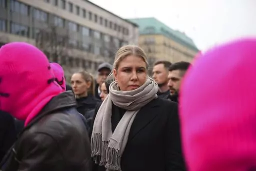 The group, which included Pussy Riot members Nadya Tolokonnikova and Lusya Shtein, as well as longtime Navalny ally Lyubov Sobol and former Russian state media journalist Marina Ovsyannikova, planned to march with the banner to the city's Brandenburg Gate but were ultimately stopped by police.