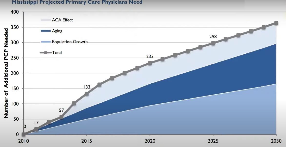 Increasing the scope of practice for nurse practitioners could help the state deal with an acute shortage of physicians. According to the most recent workforce report from the American Association of Medical Colleges on Mississippi, the number of primary care physicians per 100,000 population was 65.9, far below the national average of 90.8.