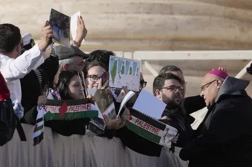 Francis spoke about the meetings at the end of his weekly general audience in St. Peter's Square, where some people in the VIP seats wearing Palestinian scarves held up small posters showing bodies in a ditch and the word “Genocide” written underneath.