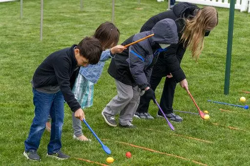 “Ready, set,” Biden said before blowing a whistle to start the competition. He later coached a young egg-roller, saying “Go, You got it!”