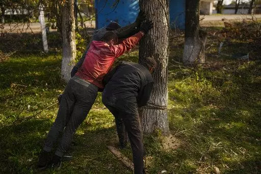 In the center of Kurylivka, a group of men used a chainsaw to bring down a tree near a bus stop. As they worked, they warned an Associated Press reporter about the Russian land mines still hidden in the surrounding grass.