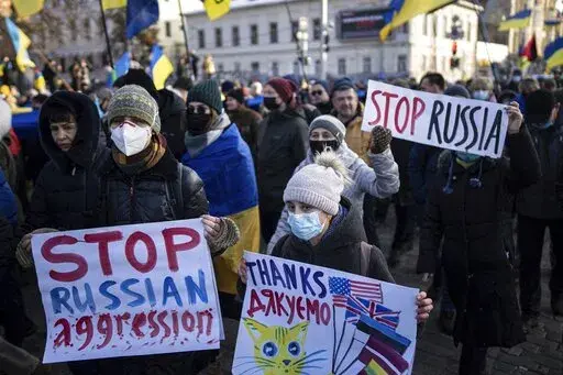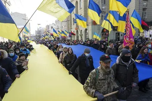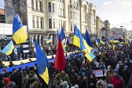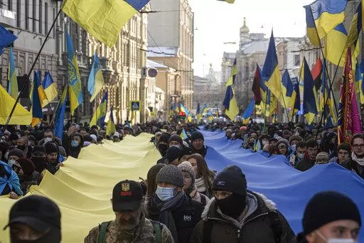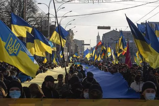 In Kharkiv, Ukraine's second-largest city just 25 kilometers (15 miles) south of the Russian border, thousands of people took to the streets Saturday carrying giant yellow-and-blue banners in the colors of the national flag in a show of determination to protect the city.