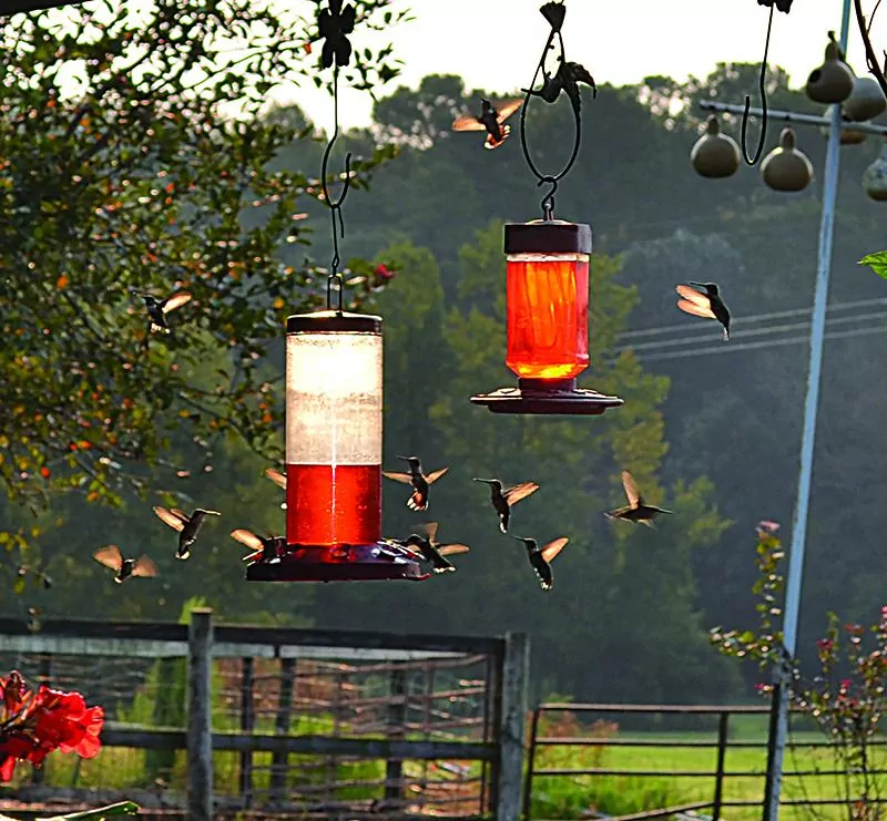 The hungry birds seem to think Gilmore’s sweet mixture is just right too as they swarm the feeders while buzzing around over his head. They will quickly dart off into a nearby tree when strangers approach — “they know something is going on,” Gilmore said — but as he tips one of the feeders, and the nectar overflows, the pack quickly returns fighting for a place at the trough.
