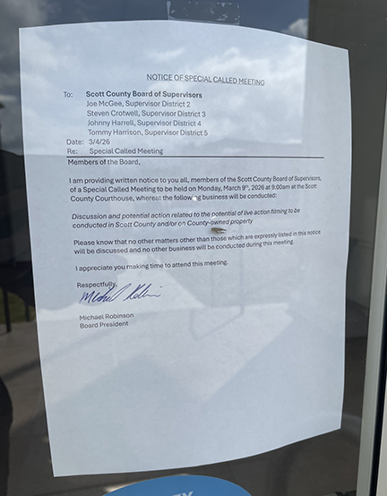 “We’ve been contacted by a film company that wants to use parts of the county’s buildings, part of the old jail and part of, maybe the courthouse, to film some scenes for some sort of movie,” Lee said. “The board is going to discuss that matter and look at some liability issues. They are wanting to film before the next board meeting. So we’re calling a special meeting just to discuss that.”