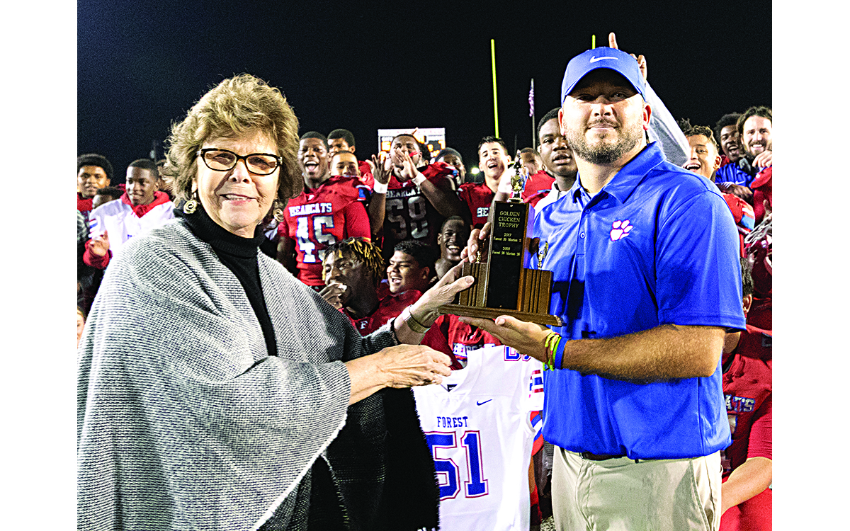 The 2019 football season has been a tough one for the Forest Bearcats, but after FHS defeated Morton 16-7 on their home field the tough season was a little easier to take. When Forest Mayor Nancy Chambers presented the Golden Chicken trophy to the Bearcats’s players and coaches there was nothing but smiles last Thursday night.