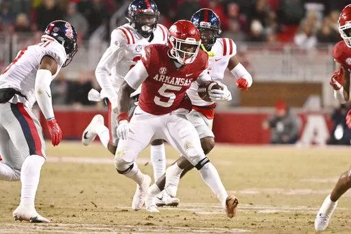 Mississippi’s Quinshon Judkins ran 24 times for 214 yards and teammate Zach Evans ran 17 times for 208 in a 42-27 loss to Arkansas on Saturday. The Razorbacks’ Raheim Sanders had 232 yards on 24 attempts.