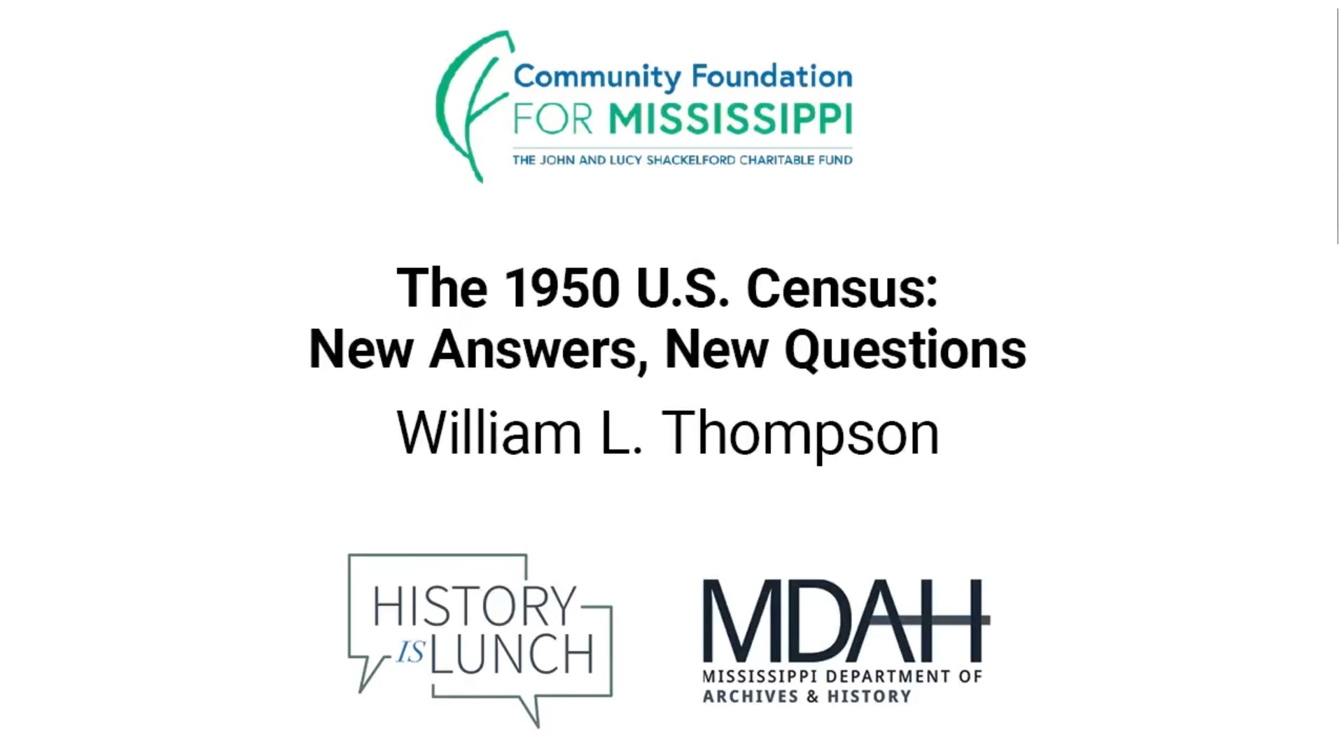 History Is Lunch is sponsored by the John and Lucy Shackelford Charitable Fund of the Community Foundation for Mississippi. The weekly lecture series of the Mississippi Department of Archives and History explores different aspects of the state's past. The hour-long programs are held in the Craig H. Neilsen Auditorium of the Museum of Mississippi History and Mississippi Civil Rights Museum building at 222 North Street in Jackson and livestreamed on YouTube and Facebook.