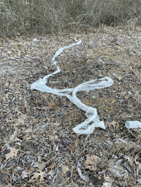 Besides the cattle feed bags, trash bags, coon, possum, and dog strewn garbage, and the thousands upon thousands of styrofoam food boxes, drink cups, beer cans and bottles, we also have Saran Wrap, or whatever it is legitimately called.