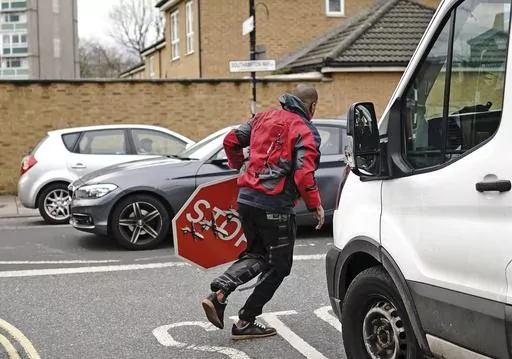 Video showed a man with bolt cutters climbing up on a bicycle to remove the work from a sign post on a street corner in the Peckham area of south London while another man steadied the bike. The man who cut the sign free then ran off with it in his hand.