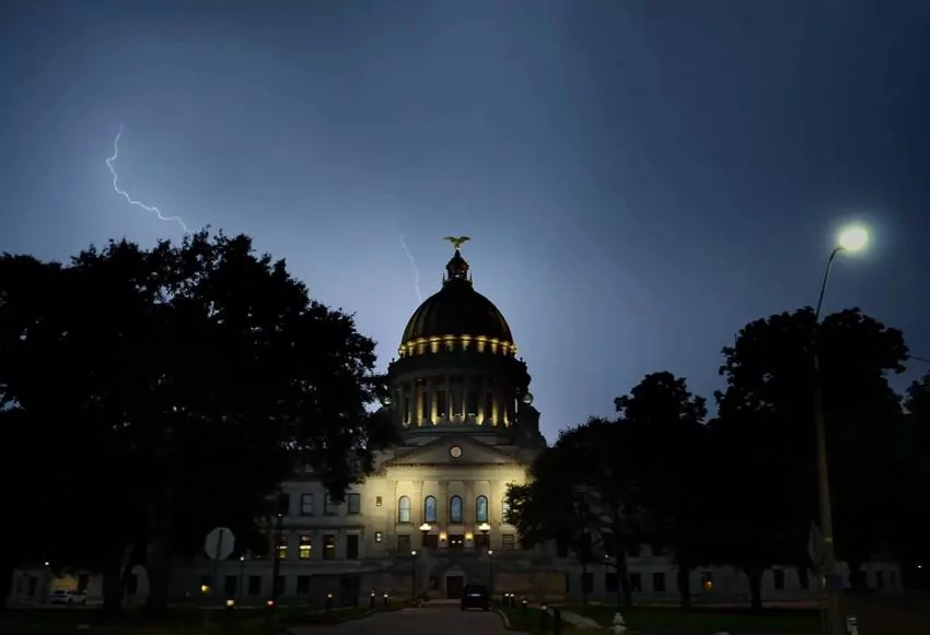 Mississippi House speaker Philip Gunn, center, and Lt. Gov. Delbert Hosemann, right, talk after Gov. Tate Reeves press conference at the State of Mississippi Woolfolk Building in Jackson, Miss., Thursday, May 7, 2020. Credit: Eric J. Shelton/Mississippi Today