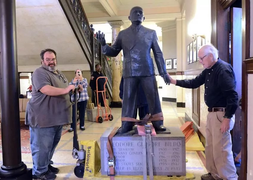 Workers with the moving company Art Logistics International, removed the statue of former Gov. Theodore Bilbo from a Capitol storage room, Friday, Dec. 16, 2022. The statue will be taken to the Two Mississippi Museums and stored in the basement. Credit: Vickie D. King/Mississippi Today