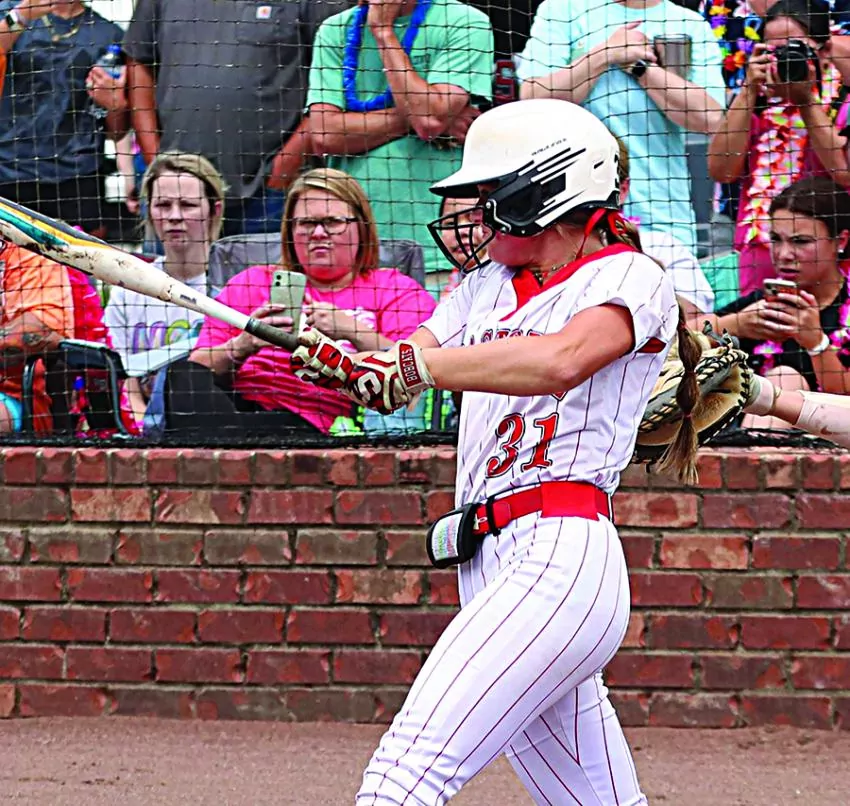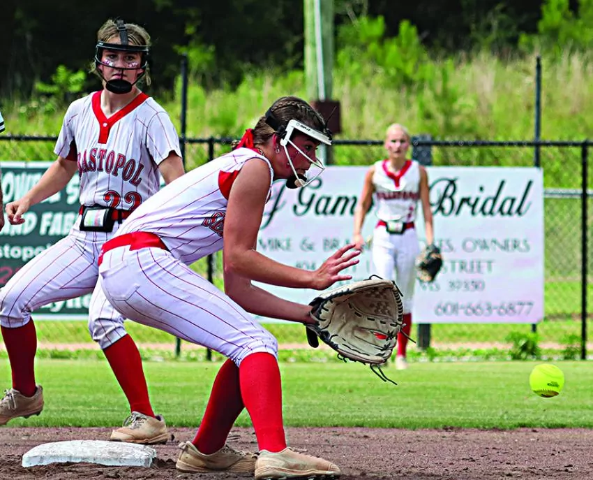 The Sebastopol Lady Cats split the first two games of their series with Ethel but took the third and deciding one Monday night to claim the South State Championship. In game two action Marlee Smith fields the throw to catch a base runner attempting to steal second base.