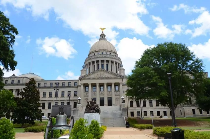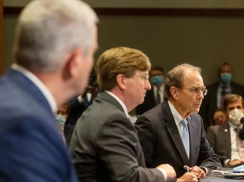 House speaker Philip Gunn, from left, and Gov. Tate Reeves listen as Lt. Gov. Delbert Hosemann speaks at the start of Gov. Tate Reeves' COVID-19 press conference at the State of Mississippi Woolfolk Building in Jackson, Miss., Thursday, May 7, 2020. Credit: Eric J. Shelton/Mississippi Today