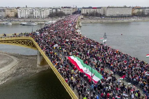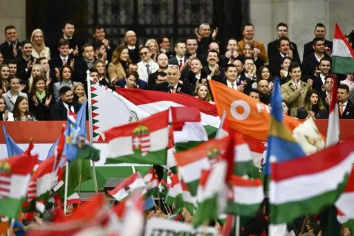 Several hundred thousand Orban supporters gathered Tuesday on the west bank of the Danube River before surging across the city's Margaret Bridge toward the Hungarian Parliament, where Orban spoke at length about the need for Hungary to keep out of the war in Ukraine.